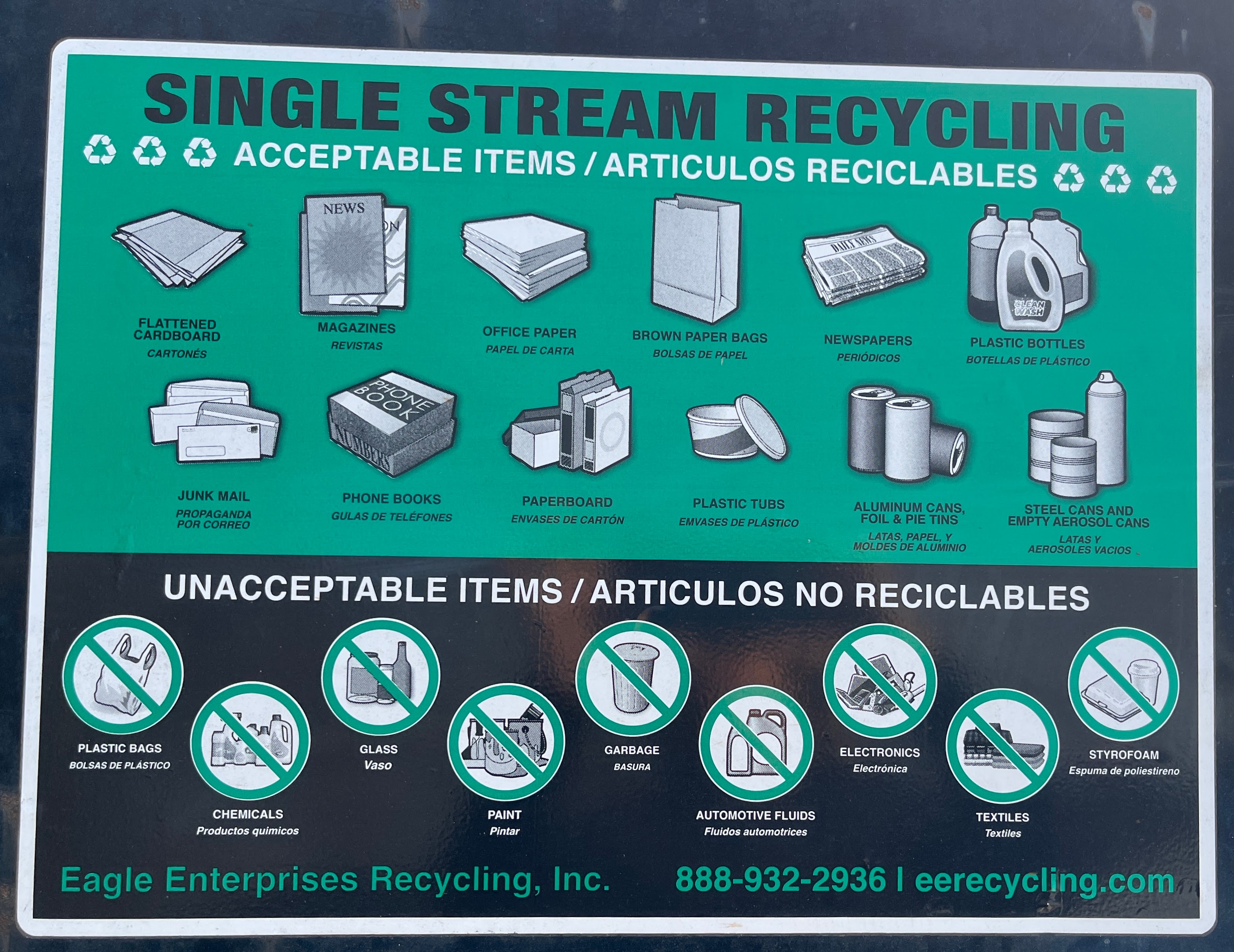 - Plastics #1 - 7, except #6 (look for the number inside the recycling triangle)